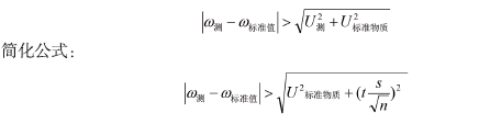 如果實驗室對標準物質的測量值超出了標準物質特性量值的不確定度范圍,是不能直接 得出測量結果存在偏差的結論的,原因是標準物質的不確定度 U 標準物質僅包括了與標準物質定 值、均勻性、穩定性有關的不確定度,沒有涉及用戶在實驗室里對標準物質進行測量有關的 隨機不確定度 U 測。因此,應采取以下通用公式判斷標準物質測量值與標準值之間存在顯著偏差: